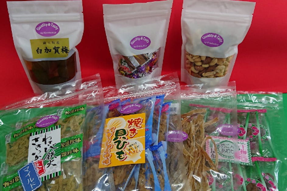 白加賀梅300g・ミックスナッツ170g・ミックスチョコ80g・うめ昆布合わせ65g・小いわしステック100g・焼貝ひもバター味70g・鉄火さきいか、以上7点セットで賞味期限21年12月