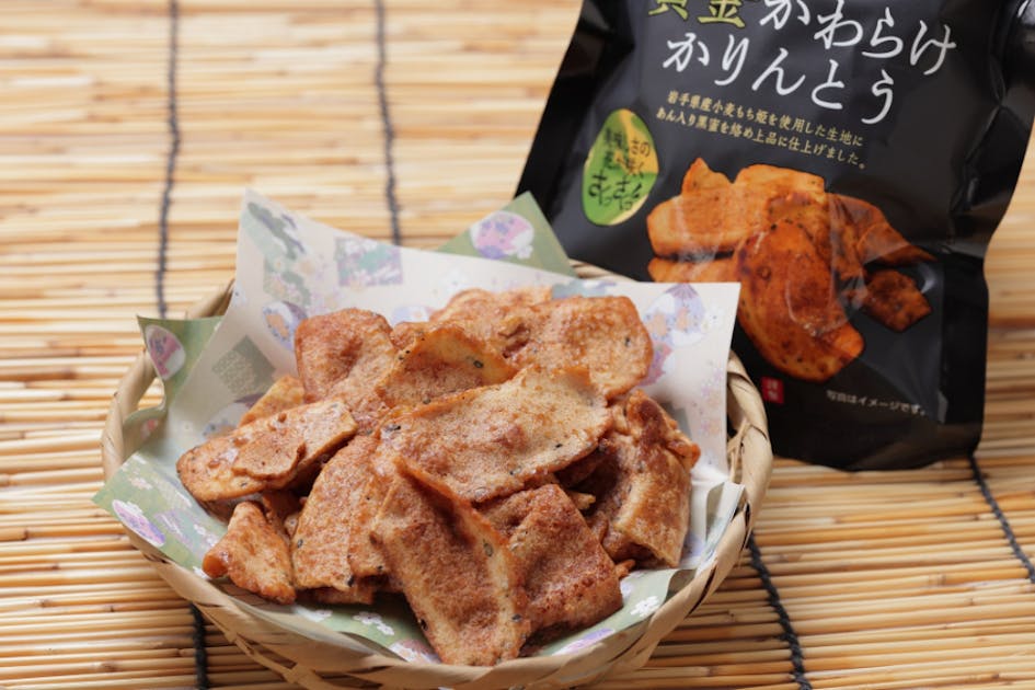 弊社は世界遺産の街「平泉」で菓子業を営んでおります。生菓子(大福など)、蒸し菓子(まんじゅうなど)、揚げ物(かりんとう・あんドーナツなど)と様々な種類の商品取り扱いがございます。なかでも主力商品であります「かわらけかりんとう」は通年販売しております「あん入り黒蜜かわらけかりんとう」と夏季限定「うま塩蜜かわらけかりんとう」、秋季限定「大学いも蜜かわらけかりんとう」と揃えておりますが、この度、世界遺産登録10周年を祝して「あん入り黒蜜かわらけかりんとう」のプレミアム版「黄金かわらけかりんとう」を発売致しました。